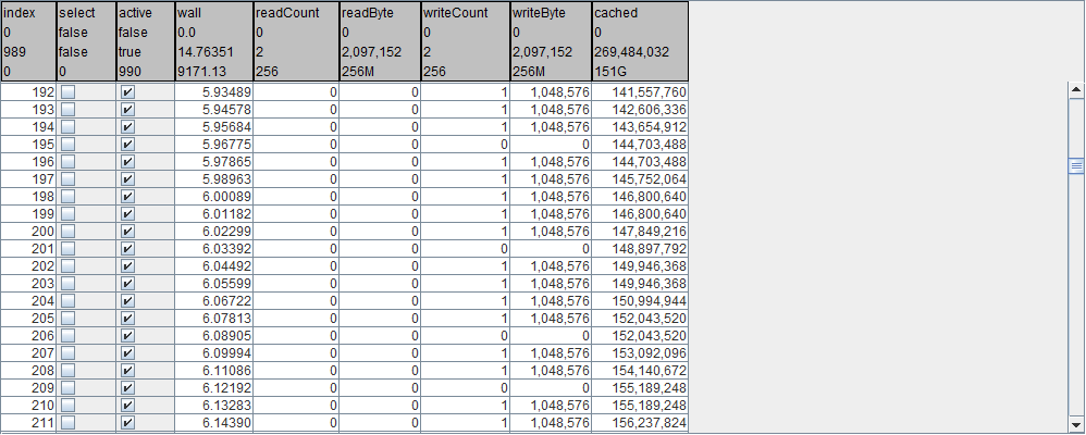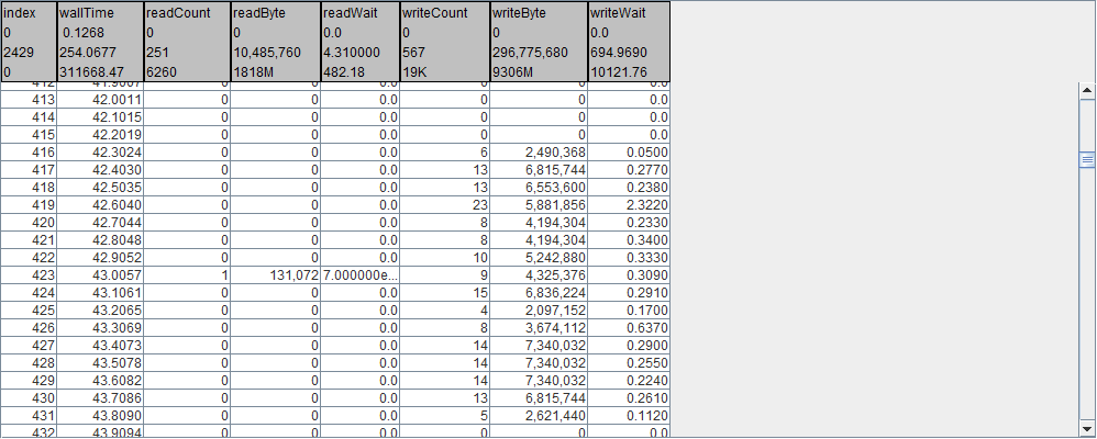 diskstats.interval={100}.devices={sd*}The above requests the following diskstats related details be logged to the ilz file at an interval of 100 milliseconds. For each selected device, both a read table and a write table are generated.