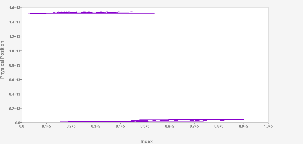 The following plot has "extent number" on the horizontal axis and "physical position" on the vertical axis. This 30,000 foot view of the file allocation shows how the start of the file is generally deep in the OST. The bulk of the file is at the start of the OST.